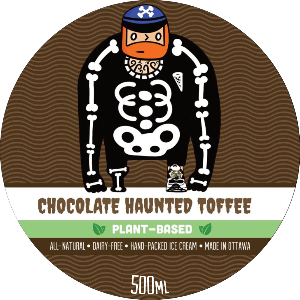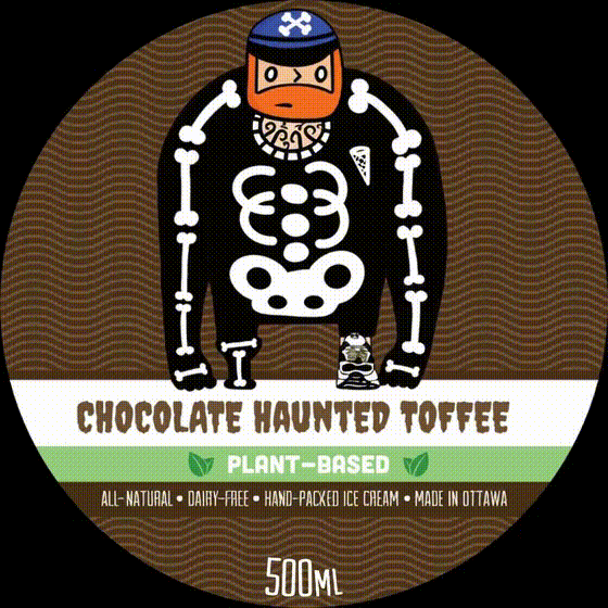 This label that features one of the many collaborations by @TRP13's Sailor Dude a figure you may have seen around Ottawa. But Sailor Dude has a haunted side and that side is at The Merry Dairy and is the inspiration for the vegan chocolate haunted toffee flavour bringing chocolate covered sponge toffee pieces, made at 102 Fairmont Avenue, into a ghostly good, nay great flavour, worthy of the Sailor Dude's haunting!