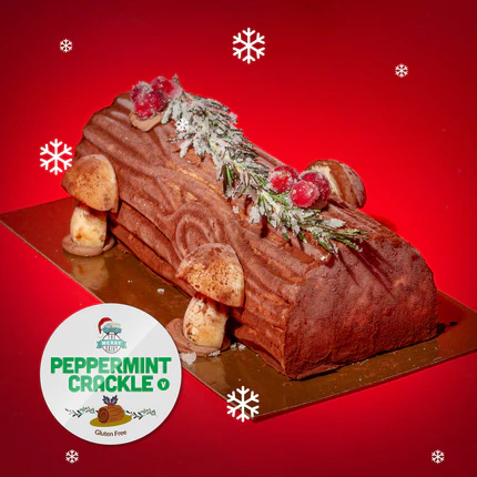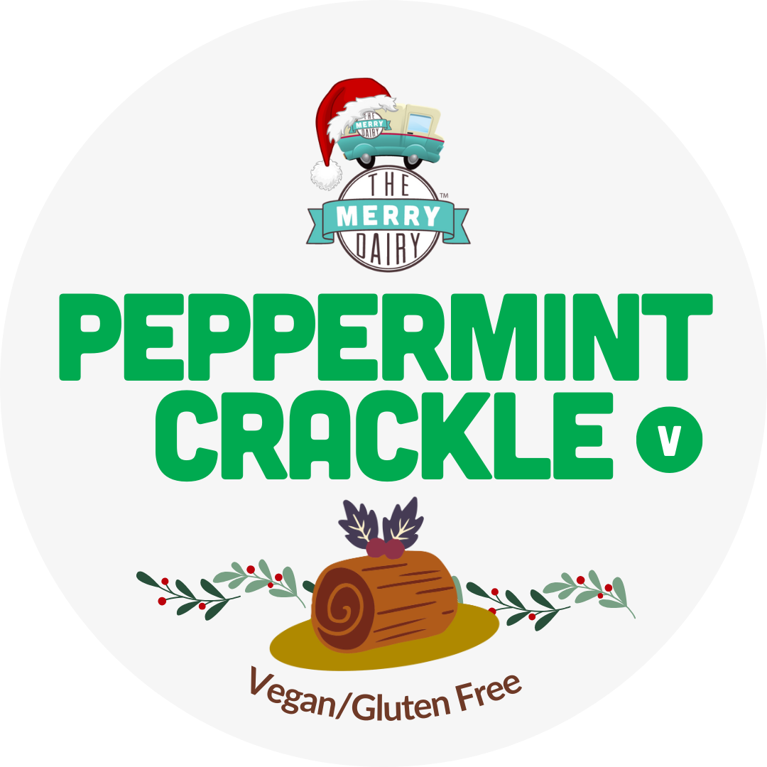 It's the vegan holiday Yule Log superhero! Swooping in for your holiday table to be the one that is all the fun with its candy cane bits, chocolate Crackle in our lovely mint vegan ice cream. Go Peppermint Crackle!